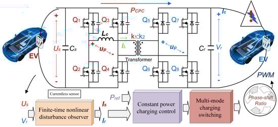 To overcome these limitations, this paper proposes a CPC control method for isolated V2V systems. A DAB converter serves as the power stage, which is modeled via single-phase-shift modulation. An finite-time disturbance observer (FTDO)-based current estimation scheme was developed to handle parameter variations with finite-time convergence, improving the power density. Feedback linearization enables robust CPC control with fast power tracking. As shown in Figure 1, the main contributions are summarized as follows:
