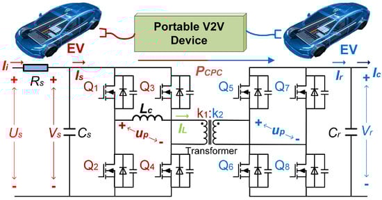 The topology selection for power electronic converters proves critical for safe and efficient V2V energy exchange. First, galvanic isolation emerges as a fundamental requirement in these converters to address inherent voltage mismatches and suppress electromagnetic interference between interconnected electric vehicles [,]. Second, the power converter must guarantee bidirectional energy flow to facilitate dynamic role transitions between EVs with varying SoC levels [,]. The DAB converter offers distinct advantages for this application: galvanic isolation through its high-frequency transformer, bidirectional power flow control via phase shift modulation, and symmetrical architecture that delivers a high power density and efficiency [,,]. However, current DAB control strategies predominantly focus on CV or CC modes, with CPC-oriented control methodologies remaining in nascent stages. Particularly under light-load conditions or input/output voltage transients, conventional proportional–integral (PI) control struggles to effectively suppress power oscillations.