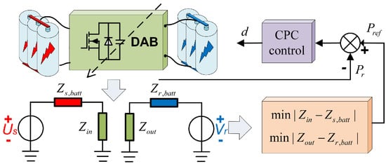 In order to improve the power density of the device, impedance matching of the V2V system needs to be considered. In the topology shown in Figure 1, the DAB converter inherently performs impedance transformation via its high-frequency transformer and phase-shift ratio d. From Equation (1), the equivalent input impedance seen by the source EV battery is derived as . Similarly, the output impedance at the receiving EV is . It can be seen that the equivalent input and output impedance of the device is determined by d. However, the specific value of d is determined by . That is, if the V2V device can achieve constant power control, the specific value of can be obtained by solving and , thereby achieving impedance matching through the dynamic adjustment of d, where and are the time-varying internal impedances of the source/receiving EV batteries. Based on previous research, can be calculated using impedance matching theory. Under the highest power density conditions, the CPC control process of the V2V system is shown in Figure 3. In this paper, we focus more on the real-time tracking of in the V2V device rather than on solving the specific value of . Specifically, and can be converted to the primary side together, which is equivalent to an input impedance for the ease of calculation.