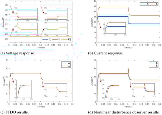 To validate the performance of the proposed observer under current sensors conditions, the controller effectiveness was tested under variable power operation. Simulations were conducted using the proposed method, where sampled values were directly employed instead of the observer. The simulation results are shown in Figure 5: the system started at 0 s with a reference power of 15 kW, which changed to 11 kW at 0.1 s. The voltage and current waveforms demonstrated that the proposed method achieved precise constant power control while maintaining system observability, with no significant voltage spikes observed at either the power source or receiving ends. As evidenced in Figure 5c, the proposed FTDO maintained fast and accurate observation during both transient processes with different power references and steady-state operation. A comparative analysis with Figure 5d revealed that the conventional nonlinear disturbance observer exhibited noticeable overshoot and delay during the dynamic processes, while the FTDO demonstrated superior observation speed and accuracy. Therefore, the proposed method outperformed the conventional approaches and was proved fully capable of supporting current-sensorless operation.