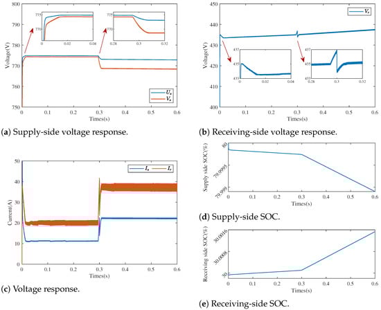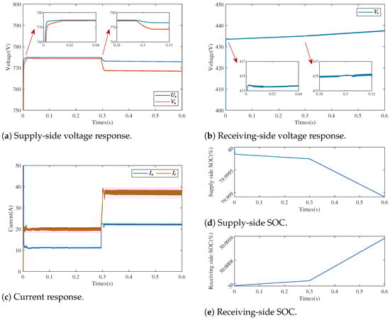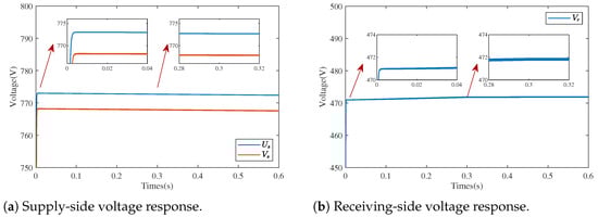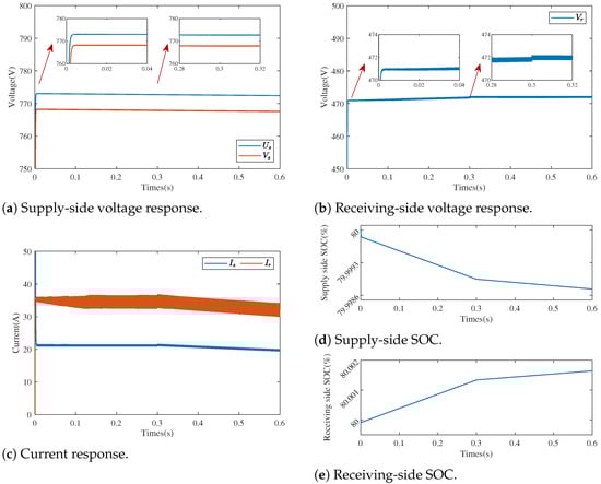 The simulation results in this section aim to validate the effectiveness of the proposed method. The simulation was performed relying on MATLAB2022a/Simulink. The topology was consistent with Figure 2. The primary and secondary filter capacitances were . The in-cavity inductance was and the transformer inductance was . The ratio of turns on the primary and secondary sides of the transformer was . The switching frequency of the PWM was 50 kHZ. The equivalent loss resistance was . Both the primary and secondary power supplies were set as lithium batteries. The rated capacity of the supply side was set to 10 Ah with a nominal voltage of 750 V, the cutoff and fully charged voltages were 720 V and 780 V, respectively. The rated capacity of the receiving side was set to 10 Ah with a nominal voltage of 450 V, the cutoff and fully charged voltages were 430 V and 470 V, respectively. The simulation was verified using the observer design and multi-stage charging.