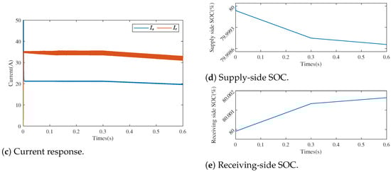 Based on the observer and the proposed control method, the simulation verification of charging mode switching was carried out. The scenario was set up so that the recipient battery was first subjected to CC charging, with a mode change to CPC at s. The traditional PI control generated a current spike exceeding 20 A at the 0.3 s switching moment, which caused voltage drops on both sides. The reference power value of CPC was 16 kW. The simulations were set up as two groups: under PI control with a voltage–current double closed loop and under the proposed method as shown in Figure 6 and Figure 7, respectively. The simulation results show that the proposed method was able to achieve the control objective during the CC to CPC switching. Compared with the PI control, both the voltage and current changed more smoothly and the switching process avoided spikes.