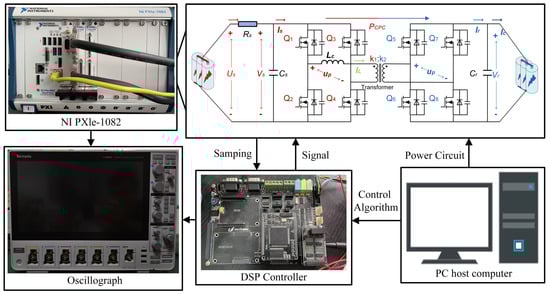 To comprehensively evaluate the proposed power-balancing approach, extended experimental validation was conducted. The test platform architecture and control implementation are detailed in Figure 10. The experimental platform consisted of a PC host computer, DSP controller TMS320F28335 (Sourced from the United States), NI PXle1082 (Sourced from the United States), and Oscillograph MSO56 (Sourced from the United States). The core of the hardware control system was the NI realtime simulator, whose main functions included sensor signal processing and control commands. In particular, the NI PXle1082 ran the power system of RIETES. The DSP was responsible for carrying out the implementation of the algorithm. The PC host was responsible for running the simulation control strategy and the construction of the V2V main circuit. The experimental parameters were consistent with those in the simulation.