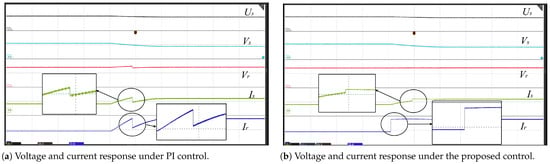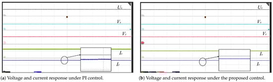 Similar to Case 2, simulations were performed to verify the effect of mode switching during the transition from CPC to CV, as shown in Figure 8 and Figure 9. First, the device adopted the charging mode of CPC and switched to CV mode at s. The PI control caused continuous ±8 V voltage oscillations at the receiving end after switching (convergence time > 50 ms). The reference power of the CPC was set to and the output voltage value of CV was set to 472 V. The smooth voltage and current transitions achieved by the proposed method confirmed its enhanced control capability. This approach exhibited lower harmonic distortion and prevented voltage transients during the mode transitions compared with the conventional PI control.