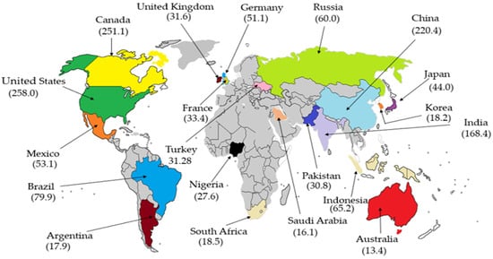 Rapid urbanization, population growth, and industrialization have led to a global spike in the generation of municipal solid waste (MSW), which is one of the most urgent environmental and socio-economic issues of the twenty-first century []. The current waste-disposal infrastructure is under tremendous pressure due to the increase in waste associated with urbanization []. Not only have conventional waste-disposal methods such as landfilling and open dumping reached their limit in many areas, but they also significantly harm the environment by generating methane emissions, soil and groundwater pollution, and other greenhouse gas (GHG) emissions []. Furthermore, the amount of waste generated is equivalent to the amount of CO2 and other GHG emissions in a certain location []. The major waste-producing countries in the world are shown in Figure 1 below [,].