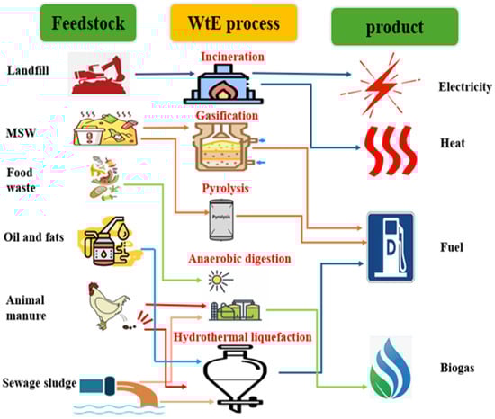During the WtE conversion of MSW, electricity, heat, and valuable gases are generated. MSW management is essential because it reduces the emission of GHG, serves as an alternative to fossil fuels for energy generation, and reduces the need for landfills. It also positively affects the economic growth of a society [,].