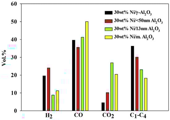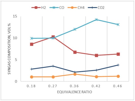 Also, Pinto et al. [] studied the co-gasification of coal, biomass, and waste plastics using a fluidized-bed method. They observed that an improved gasification temperature boosts the subsequent breaking of produced hydrocarbons, releasing more hydrogen and reducing tar formation.