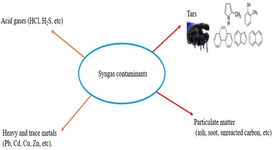 Gasification is a thermochemical process [] that produces a variety of gases, known as producer gas, product gas, synthetic gas, or syngas [], when carbon-rich materials (fuel) like coal, biomass, or MSW (refuse-derived fuel, waste sludge, polymeric material) react with a gasification agent like air, oxygen, steam, carbon dioxide, or a combination of these in the presence of a small amount of oxygen. A mixture of CO, H2, N2, CO2, methane, and other low-molecular-weight hydrocarbons constitutes syngas. There may also be trace levels of tars, NH3, and H2S [,,].