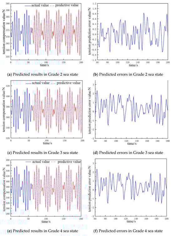 From Figure 4 and Figure 5, it can be concluded that the fluctuation range of the cable tension compensation value is larger when the weight of the catch is larger and the sea-state grade is higher. Concurrently, the error of the predicted tension value also increase, which is more obvious in the high-grade sea state. However, they are all within the range of the accuracy requirement. Furthermore, an analysis of Table 2 and Table 3 reveals that increases in catch weight and sea state result in an escalation in the number of nodes necessary for the output and hidden layers of the neural network. However, the number of nodes required for the input layer remains consistent; when this number increases, the amount of computation required by the neural network increases. It is therefore necessary to take into account the prediction accuracy of the neural network and the amount of computation as well as to adjust to the optimal number of nodes of the input layer and the hidden layer.
