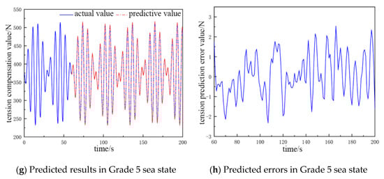 In Figure 5a,b, the fluctuation range of the cable tension compensation value is 385 to 443 N, and the error of the tension prediction value ranges from −0.73 to 0.9 N. In Figure 5c,d, the fluctuation range of the cable tension compensation value is 343 to 483 N, and the error of tension prediction value ranges from −1.25 to 2.2 N. In Figure 5e,f, the fluctuation range of the cable tension compensation value is 275 to 560 N, and the error of the tension prediction value ranges from −3.1 to 2.2 N. In Figure 5g,h, the fluctuation range of the cable tension compensation value is 180 to 650 N. and the error of the tension prediction value ranges from −2.8 to 3.4 N.