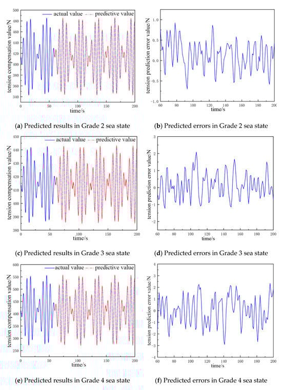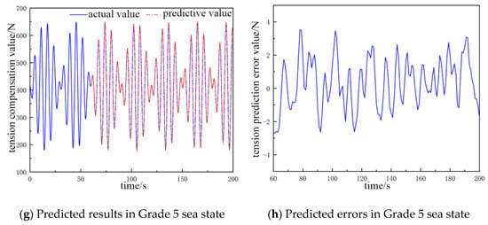 In Table 3, the structure of the network in the Grade 2 sea state is 15-6-1, the average error is about 0.47 N, and the prediction accuracy is 97.1%. There are seven hidden layers in the neural network structure in the Grade 3 sea state, and the average error is 0.48 N, which is 0.01 N more than that in the Grade 2 sea state, and the prediction accuracy is 97.5%, and the accuracy is 0.4% more than that in the Grade 2 sea state. The input layers of the neural network structure increase to 16 in the Grade 4 sea state, and the average error is 1.67 N, which is 1.19 N more than that in the Grade 3 sea state. The prediction accuracy is 98.2%, and the accuracy is 0.7% more than that in the Grade 3 sea state. The input layers of the neural network structure increase to 17 in the Grade 5 sea state, and the average error is 2.01 N, which is 0.34 N more than that in the Grade 4 sea state. The prediction accuracy is 98.7%, and the accuracy increases by 0.5% relative to the Grade 4 sea state.