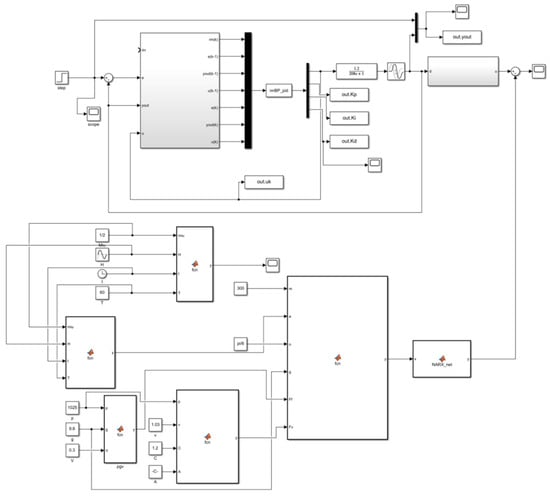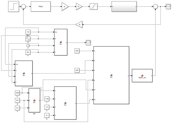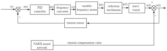 The cable tension compensation value prediction model is predicated on a combination of a NARX time-series neural network and traditional PID control. The model was constructed in a MATLAB/Simulink trawl winch cable constant tension control system, as illustrated in Figure 7.