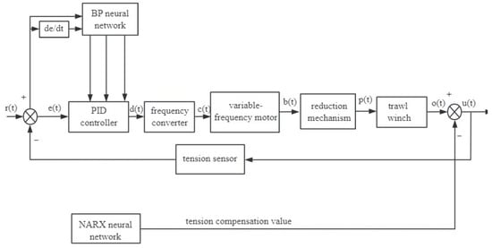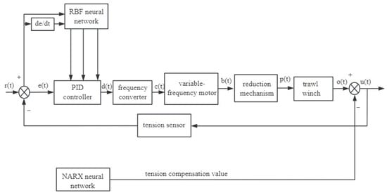 Currently, there are two mainstream tension control methods: hydraulic differential control and PID control. Although hydraulic differential control [,,,] regulates tension, its dynamic response speed is limited by the compression of the hydraulic oil and the elasticity of the pipeline, the system stability is poor, being prone to jitter or instability phenomena. The PID control method [,,] for momentary changes in tension parameters needs to be adjusted frequently, reducing the practicality and robustness of the system, and coping with the nonlinear change in the trawl winch cable tension is also a challenge. In addition to this, the time delay between sensor measurement and controller actuation can lead to poor control [].