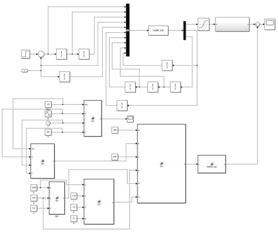 As demonstrated above, conventional PID control is deficient in its capacity to address nonlinear challenges and exhibits an absence of adaptive capability in adjusting parameters []. In practical applications, the control system is susceptible to uncertainty due to external variables, resulting in suboptimal performance outcomes []. Consequently, a combination of the radial basis RBF neural network and conventional PID control was used to construct a PID controller based on an RBF neural network, as illustrated in Figure 8.
