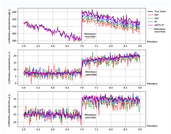 We compare the AMTS-PF against three established estimation approaches: (1) Extended Kalman Filter (EKF): Implementation follows [43] with first-order Taylor approximations of ASM1 kinetics. (2) Unscented Kalman Filter (UKF): uses the sigma-point transformation from [44] with , , and . (3) Standard Particle Filter (PF): baseline SIR filter [45] with 1000 particles and systematic resampling.