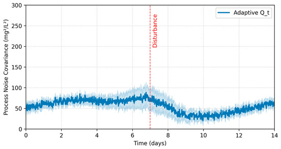 This dynamic adjustment proves critical for maintaining estimation accuracy during the transition between normal and shock loading conditions. The measurement noise covariance similarly adapts to sensor performance variations, with the NH4+ analyzer noise estimate increasing by 32% during a known sensor drift period (days 9–11).