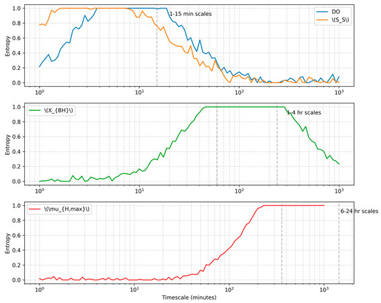 The wavelet entropy analysis effectively identifies dominant timescales in process variables, as demonstrated in Figure 5. The entropy profiles clearly differentiate between high-frequency dynamics (1–15 min scales) in DO and medium-frequency variations (1–4 h scales) in low-frequency trends (6–24 h scales) in .
