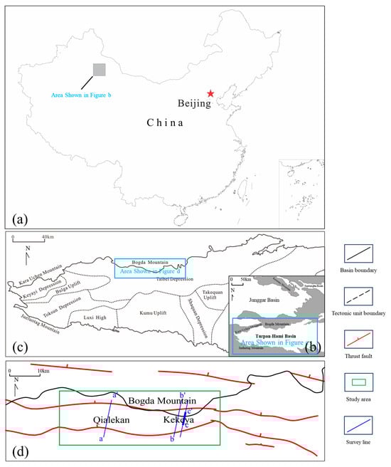 Structural geological overview of the northern piedmont zone of the Turpan–Hami Basin: (a) location of the Turpan–Hami Basin in China; (b,c) tectonic framework of the northern piedmont zone; and (d) location map of typical seismic profiles.