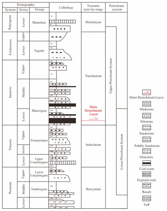 The Turpan–Hami Basin is located in the Xinjiang Uygur Autonomous Region in northwestern China and is one of the three major petroliferous basins in the region []. The piedmont zone is located in the basin–mountain transitional area between the northern margin of the Turpan–Hami Basin and the Bogda Mountains (Figure 1c). This region has undergone multiple episodes of compressional deformation during the Indosinian, Yanshanian, and Himalayan tectonic activity phases [,,]. Among them, the central segments—namely, the Qialekan and Kekeya areas—are characterized by intense structural deformation and concentrated compressive stress, making them key target zones for hydrocarbon exploration breakthroughs in the northern piedmont belt []. The study area is underlain by high-quality Permian Taodonggou Formation source rocks and is adjacent to Jurassic Shuixigou Formation hydrocarbon-generating depressions. Both sets of source rocks have currently entered the mature stage, exhibiting strong hydrocarbon generation potential and sustained expulsion capability []. Lithological and seismic data reveal the widespread development of a 40–60 m thick coal-bearing formation within the Lower Jurassic, which constitutes an important regional detachment layer and seal (Figure 2). Vertically, this coal-bearing interval not only divides the study area into two structural layers with distinctly different deformation styles but also effectively separates the formation of two independent petroleum systems above and below [].