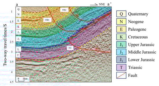 Seismic profile a–a′ (Figure 4), which traverses the Qialekan area along the NNE direction, displays well-preserved wedge-shaped structures developed beneath the Lower Jurassic coal-bearing detachment layer. The wedge geometry is formed by the interaction of an interlayer detachment fault and the FI1 thrust fault, reflecting compressional deformation during the Jurassic period. The wedging of these structures causes the overlying strata to be uplifted, inducing the development of multiple reverse faults that terminate at the detachment layer. Additionally, reverse faults beneath the detachment layer typically exhibit gentler dip angles, indicating early-stage tectonic activity.