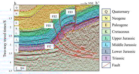 Seismic profile b–b′ (Figure 5), which traverses the Kekeya area along the NNE direction, reveals significant modification of the wedge-shaped structures. The wedge is composed of the FI2 fault and an interlayer detachment fault. From south to north, faults FII1, FII2, and FII3 are distributed sequentially, penetrating the detachment layer and extending into the middle and shallow strata. These faults exhibit strong activity and have substantially disrupted the integrity of the wedge structure. They generally display steep dips in their upper sections and gentler angles at greater depths. Additionally, some of these fault zones breach the surface and show evidence of erosion resulting from intense compressional thrusting.