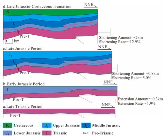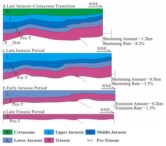 During the Early Yanshanian orogenic phase, the Bogda Mountains continued to thrust southward, inducing intense thrusting and nappe deformation within the study area. This led to interlayer detachment within the Lower Jurassic coal-bearing strata, forming detachment faults that, in combination with pre-existing Triassic thrust faults, generated wedge-shaped structural bodies. Subsequently, sustained strong compressional stress drove these wedges to progressively insert into the basin, producing a basal wedging effect. This not only caused uplift of the overlying strata in the central segment of the piedmont zone but also resulted in the continued deep burial of the underlying Permian source rocks beneath the wedge. During this period, the a–a’ profile across the Qialekan area experienced a shortening of approximately 0.5 km, corresponding to a shortening rate of ~3.3% (Figure 6c), while the b–b’ profile across the Kekeya area shortened by about 0.8 km, with a shortening rate of ~5.2% (Figure 7c).