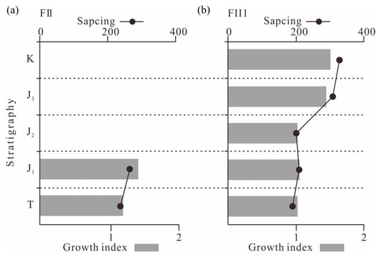 Using faults FI1and FII1 identified in the two seismic profiles discussed earlier as examples, the variation patterns of the growth index are analyzed (Figure 8). Fault FI1 exhibits a growth index significantly greater than 1 during the Lower Jurassic depositional stage, indicating strong fault activity at that time. In contrast, growth index in other periods approach or equal 1, suggesting weak or nearly inactive fault movement during those stages. In the Kekeya area, Fault FII1 demonstrates relatively high growth indices during both the Cretaceous and Upper Jurassic depositional periods, with the highest values observed during the Cretaceous. This suggests that the fault was most active during the Cretaceous, followed by a moderately active phase in the Upper Jurassic.