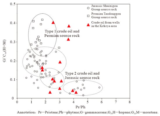 Relationship between Pr/Ph and G/C30(H+M) for source rock extracts and crude oil samples in the Kekeya area of the northern piedmont zone. (Hao, B. et al., 2022 [], modified).