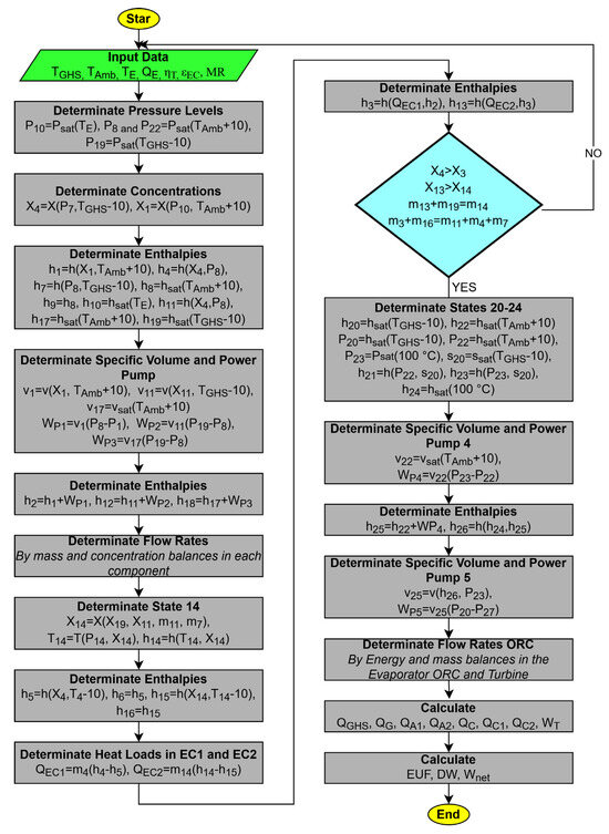 Figure 3 shows the algorithm solution process, where the input variables are entered into the software. In this case, a cooling heat load () of 100 kW was established, as well as the source temperature (TGHS), ambient temperature (TAmb), economizer effectiveness (ε), and turbine efficiency (ηT). Once these values are entered, the pressure levels under which the system operates are determined, using the saturation states as a reference. With the pressure and temperature levels at states 4 and 1, the concentration of the mixture in the cooling system streams is determined. Knowing the pressure, temperature, and concentration levels, and considering the saturation states at the condenser, absorber, and generator outlets, the enthalpies at states 1, 4, 7, 8, 9, 10, 11, 17, and 19 are determined. Subsequently, based on the pressure levels and fluid conditions at the pump inlet, the power pump and the enthalpy of the fluids at the outlet of these components can be determined (states 2, 12, and 18). Using mass balances for each component, the fluid flows within the system are determined, and with these, states 14, 5, 6, 15, and 16 can be determined. With the effectiveness of the thermal energy transfer in the economizers, the enthalpies of states 3 and 13 are determined. At this point, the computational model compares the concentration values in both the heat transformer (HT) and the absorption cooling system (ACS). If the concentrations are adequate, the states corresponding to the organic cycle are determined and, finally, the evaluation parameters, DW, , and EUF, are calculated. If the flow rates or concentrations are inadequate, the process is repeated, and the input variables must be adjusted.
