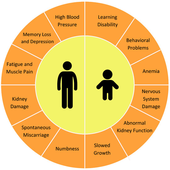 The Pb poisoning and its severe effects are evident worldwide. Its drastic effects are seen in both children and adults. In children, the effects can range from anemia and slowed growth to severe outcomes such as nervous system damage and seizures [20]. Apart from adults exhibiting signs of high blood pressure, memory problems, nerve damage, and so on, pregnant women are mainly suffering from a higher risk of miscarriage [4,20].