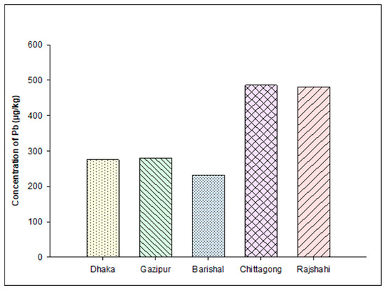 The average lead (Pb) concentration found in broiler chicken samples collected from various regions in Bangladesh, expressed in µg/kg [25].