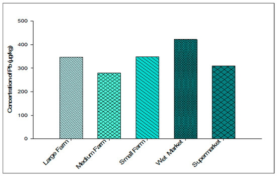 The concentration of lead (Pb) found in broiler meat samples collected from various market setups in Bangladesh, expressed in µg/kg [25].