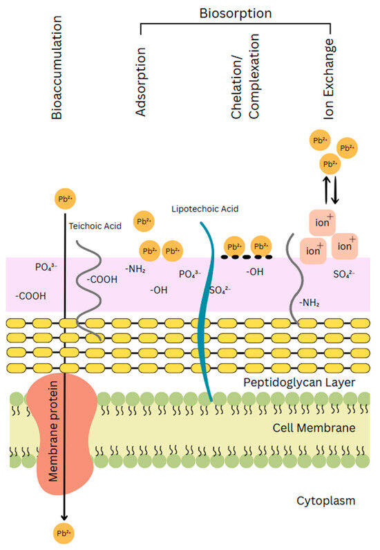 LABs can effectively bind to heavy metals through various mechanisms, notably a metabolism-independent process known as biosorption and a metabolism-dependent process known as bioaccumulation, showcasing their remarkable capability to interact with and potentially mitigate environmental contaminants [36,40]. Biosorption, a passive surface-binding mechanism, can be used to remove metals in both viable and nonviable stages, enabling Pb2+ metal to interact with anionic groups in bacterial cell walls [33,43]. The overall negative charge across the cell wall of LABs facilitates interaction with positively charged metal ions like Pb2+ [44]. In contrast, bioaccumulation is an active, metabolism-dependent process of ion binding by microbes that involves the transport of metal ions across the cell membrane through specific transmembrane proteins. This mechanism is highly regulated by cellular metabolism and occurs exclusively in viable cells, often serving as a microbial strategy to cope with heavy metal stress [40]. In such cases, the uptake of metal ions requires energy, as it involves active transport across the cell membrane and carrying out metabolic functions. Bacterial cell walls, composed of a complex matrix of polysaccharides and proteins, separate metal ions due to their numerous active sites. According to a study by Lin et al. [15], two hypothesized models have been proposed for this separation. The first model suggests metal ions are transported to cytoplasm and isolated in a specific region to minimize damage to other cellular components. The latter involves a metal-binding protein that aids in metal detoxification through the formation of stable metal chelates [15]. Moreover, in a comprehensive review by Massoud and Zoghi [11], it was highlighted that some LABs also produce exopolysaccharides (EPS) layers composed of negatively charged carboxyl, hydroxyl, amine, acetate, sulfate, and phosphate groups, increasing the bacterial cell negativity. This claim was backed by Chapot-Chartier and Kulakauskas [44], where it was stated that dead or nonviable bacterial cells can passively bind to heavy metals by several physiochemical mechanisms, such as ion exchange, complexation, adsorption, and chelating (Figure 5) [11]. Heavy metal ions can replace protons that are initially bound to functional groups on the bacterial cell membrane. Negatively charged moieties in LABs, such as carboxyl, phosphate, and hydroxyl, act as proton exchange sites. Research has demonstrated that LAB strains exhibiting a higher net negative surface charge show enhanced binding affinity for Pb2+ ions [15]. The ion exchange mechanism is often a rapid process compared to the other. Complexation involves the formation of coordination bonds between metal ions and electron-donating functional groups located on the bacterial cell wall. Carboxyl (-COOH) groups of peptidoglycan polymers and the carboxyl (-COOH) groups and phosphate (-PO43−) groups of phosphoric acid act as ligands that bind to heavy metal ions such as Pb2+ through non-covalent interactions [45]. The overall negative charge on the cell membrane of LABs facilitates the chelation of various transition metal ions. These metal-binding sites, rich in macromolecules such as proteins and polysaccharides containing teichoic acids or exopolysaccharides, enable the accumulation of Pb2+ through stable interactions once the sites become saturated [46]. In another study, Tian et al. [47] proved that nonviable Lb. plantarum CCFM8661 showed almost similar Pb2+ binding ability as viable cells, with the highest biosorption level of 53 mg/g dry mass. These mechanisms enable rapid and stable binding of Pb2+, making LABs efficient Pb2+ removal agents.