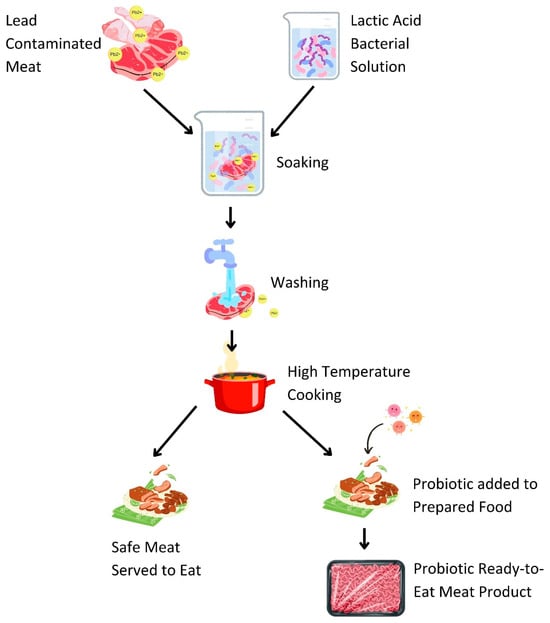 Studies have repeatedly shown that LABs in aqueous solutions can bind to Pb2+, reducing their bioavailability [11,12,48,49]. Introducing Pb-contaminated raw meat to an aqueous solution of LABs allows the organisms to interact with the meat, binding to the available Pb2+ present in it (Figure 6). The timing of introducing LABs to the meat needs to be calculated so that the organisms have sufficient time to maximize ion binding but not long enough to cause fermentation that changes the raw meat’s overall quality.