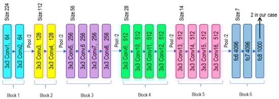 where ‘’ refers to class i, for which the probability estimates are being made, represents the output for the j-th class form the final layer, and indicates the final output layer of the neural network structure. The architecture of VGG19 is illustrated in Figure 2.