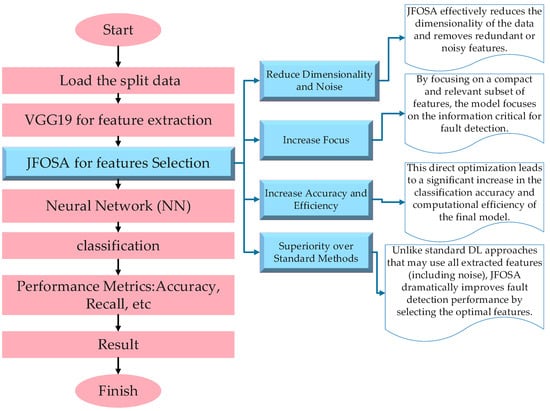 To address these issues, this paper introduces a novel approach that combines VGG19 for feature extraction with the Jellyfish Optimization Search Algorithm (JFOSA) for optimal feature selection. The hybrid model aims to improve fault detection accuracy, reduce computational complexity, and enhance model generalizability across a wide range of operational conditions.