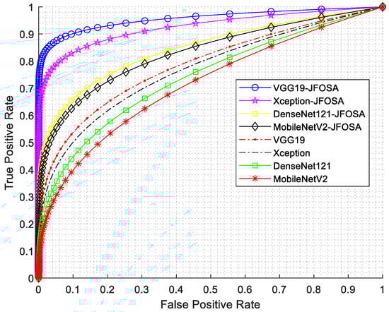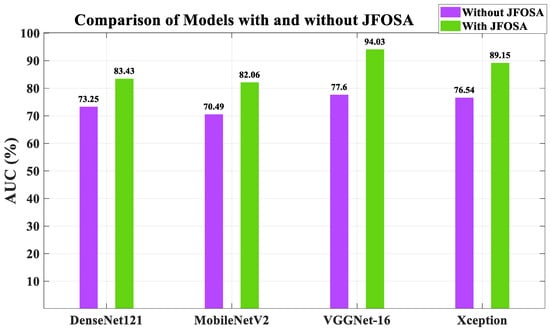 Figure 6 presents a bar graph comparing the AUC metrics for four different DL models: DenseNet121, MobileNetV2, VGGNet-16, and Xception. This figure clearly shows that for all four deep learning models, using the JFOSA method for feature selection results in a significant improvement in AUC performance. This indicates that JFOSA effectively selects more relevant features, resulting in better discrimination capabilities for the classification tasks for which these models are designed. VGGNet-16 shows the largest improvement in AUC when applying JFOSA.