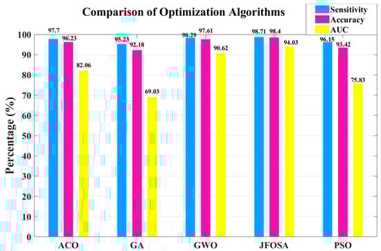 Figure 7 presents a comparative evaluation of the five optimization algorithms—Ant Colony Optimization (ACO), Genetic Algorithm (GA), Gray Wolf Optimization (GWO), Particle Swarm Optimization (PSO), and the new approach (JFOSA)—based on sensitivity, accuracy, and AUC. The results show that JFOSA consistently outperforms the others in all criteria, achieving a sensitivity of 98.71%, an accuracy of 98.4%, and a leading AUC of 94.03%. Although GWO slightly outperforms JFOSA in sensitivity and ACO performs relatively well, both GA and PSO show poorer results overall. These findings confirm the effectiveness and balanced performance of JFOSA within the proposed framework.