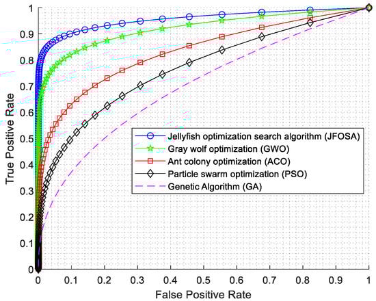 Figure 8 illustrates the ROC curves of five optimization algorithms (JFOSA, GWO, ACO, PSO, and GA) used to evaluate classification performance. JFOSA’s curve (blue) is consistently closest to the top-left, indicating superior performance across thresholds. GWO follows closely, while ACO performs moderately well. In contrast, PSO and GA demonstrate weaker performance, with curves positioned lower and to the right. Overall, JFOSA achieves the best balance between TPR and FPR, confirming its effectiveness for classification tasks in this study.