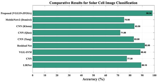 The proposed VGG19-JFOSA method was evaluated against several state-of-the-art solar panel defect classifications. As summarized in Table 3 and illustrated in Figure 9, the proposed method outperforms all existing models, achieving a classification accuracy of 98.34%.