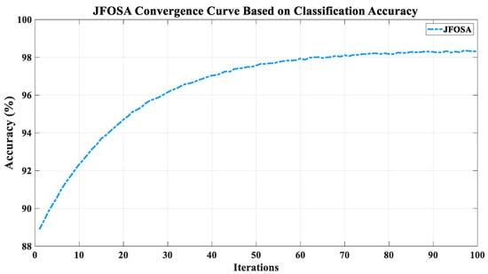 To further evaluate the effectiveness of the proposed JFOSA, its convergence behavior was analyzed over 100 iterations. As shown in Figure 10, the classification accuracy increases rapidly during the first 30 iterations, indicating that the algorithm quickly identifies a near-optimal subset of features. After this point, the curve gradually flattens out, indicating stable and consistent performance with minimal changes, confirming the convergence of the algorithm.