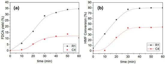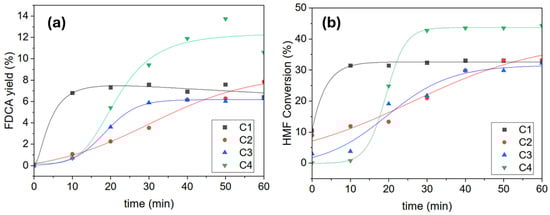 | Catalyst | Route | Calcination (400 °C; 4 h) | FDCA Concentration (g/L) | FDCA Yield (%) | FDCA Selectivity (%) | HMF Conversion (%) |
