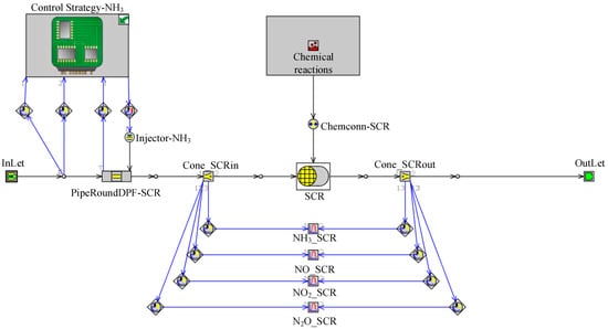 The overall SCR reaction kinetics model, illustrated in Figure 2, was constructed using GT-Power and consists of six main modules: inlet gas processing, catalyst reactor configuration, surface reaction kinetics, outlet gas analysis, sensor acquisition, and data processing. The model considers both heat and mass transfer between the catalyst coating and the laminar flow within the reactor channels, allowing for accurate simulation of transient SCR reaction behavior. This structure enables GT-Power to dynamically capture the interactions between flow, temperature, and chemical conversion processes during NOx reduction and NH3 leakage prediction.