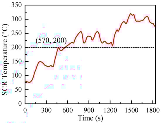 To investigate the NOx emission and other exhaust parameters during cold-start and mid- to low-load working conditions, a diesel engine emission experiment was carried out using the World Harmonized Transient Cycle (WHTC) at a time resolution of 0.1 s. The collected data included engine speed, intake temperature and pressure, NOx mass flow rate at the SCR inlet, urea injection volume, and the outlet concentrations of NH3 and NOx. The urea solution used for all experiments was commercial-grade automotive urea (AdBlue®, 32.5% purity, produced by Tianjin Kunhua Chemical Co., Ltd., Tianjin, China). The concentrations of NH3 and NOx used for calibration and validation were obtained from experimental bench measurements. NO and NOx concentrations were measured using a HORIBA MEXA-ONE-RS analyzer (Horiba, Ltd., Kyoto, Japan; chemiluminescence detection, CLD), and NH3 concentrations were measured using a BRUKER OMEGA-5 analyzer (Bruker, Billerica, MA, USA; Fourier transform infrared spectroscopy, FTIR). Both analyzers have a measurement range of 0–10,000 ppm and an accuracy of ±2% of reading, ensuring the high reliability of the emission data used in this study. The total duration of the WHTC cycle was 1829 s, resulting in 18,290 data points representing dynamic engine operating conditions. Among the recorded parameters, the exhaust temperature upstream of the SCR system was continuously monitored and is shown in the temperature curve depicted in Figure 3. During the initial cold-start phase (0–570 s), the exhaust temperature remained consistently below 200 °C. This low-temperature condition necessitated the suspension of urea injection to prevent the risk of urea crystallization within the SCR system. Consequently, SCR outlet NO and NO2 concentrations during this period closely matched the inlet levels, indicating the absence of NOx conversion reactions. After approximately 570 s, the exhaust temperature gradually increased as the engine warmed up, reaching levels sufficient to enable urea injection and initiate standard SCR operation. For the purposes of our LSTM-attention study, the analysis focused primarily on the period between 570 and 1829 s.