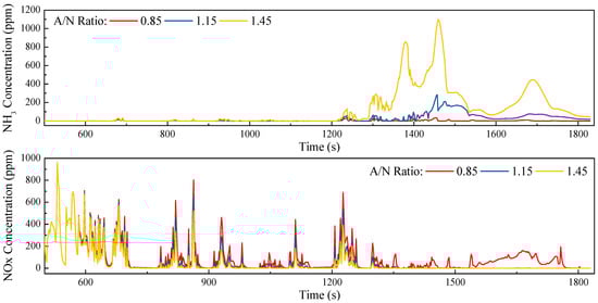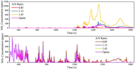 Time-series comparison of NH3 and NOx emissions under different fixed A/N ratios.