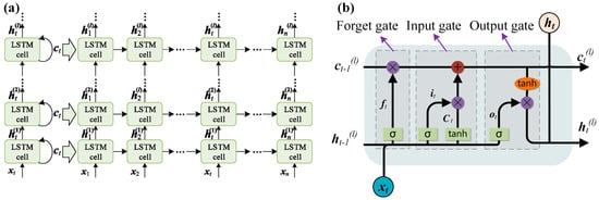 (a) The standard architecture of LSTM neural network with multiple hidden layers; (b) the architecture of an LSTM cell of lth LSTM layer at time step t.