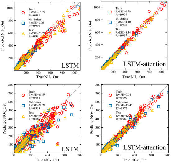 Similarly, for NOx prediction, the LSTM-attention model significantly reduces the RMSE, particularly on the test set (12.31 compared to 31.13), and achieves better linear agreement between the predicted and measured values. Moreover, both models exhibit high overall predictive accuracy, with R2 values generally exceeding 0.95 across all phases. The incorporation of the attention mechanism effectively enhances the model’s ability to capture complex temporal dependencies, thereby improving its precision and robustness. Furthermore, we report the Mean Absolute Error (MAE) for all datasets to provide a more intuitive evaluation of the average prediction error. For NH3 prediction, the LSTM-attention model achieves MAE values of 1.78, 1.47, and 2.66 for the training, validation, and test sets, respectively. For NOx prediction, the corresponding MAE values are 3.32, 5.21, and 4.77. These MAE results, together with RMSE and R², demonstrate that the LSTM-attention model maintains superior accuracy and robust generalization compared to the standard LSTM across all dataset splits.