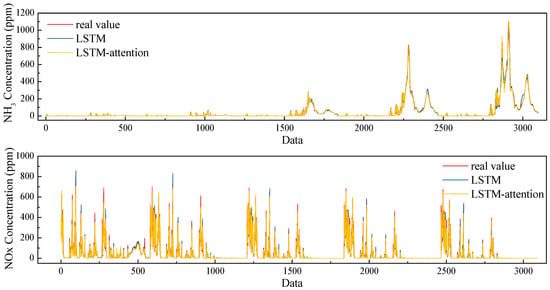 To further validate the temporal prediction performance, Figure 8 presents the time-series evolution of predicted and true NH3 and NOx concentrations using the trained models. The left subplot depicts the NH3 concentration profile, while the right subplot corresponds to the NOx concentration profile. In both cases, the LSTM-attention model predictions exhibit a closer alignment with the real measurements compared to the standard LSTM, particularly in capturing peak values and dynamic fluctuations. These results further confirm that incorporating an attention mechanism enhances the model’s ability to capture complex temporal dependencies, improves predictive precision, and ensures robust generalization across various emission prediction scenarios.
