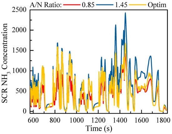 Time-series profiles of SCR NH3 concentrations under different A/N ratios and optimized control. The red line represents a fixed A/N ratio of 0.85, the blue line denotes a fixed A/N ratio of 1.45, and the yellow line corresponds to the dynamic optimized control strategy. Note: All time series correspond to a single simulated WHTC cycle.