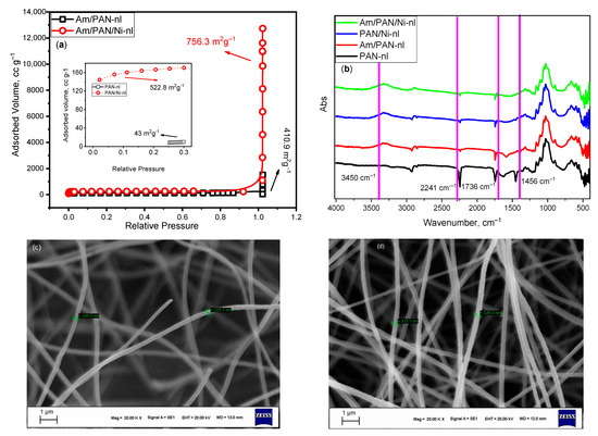 (a) The adsorption isotherm and (b) FT-IR spectrum for all nanofibers, (c) SEM images of PAN-nl, and (d) SEM images of Am/PAN/Ni-nl.